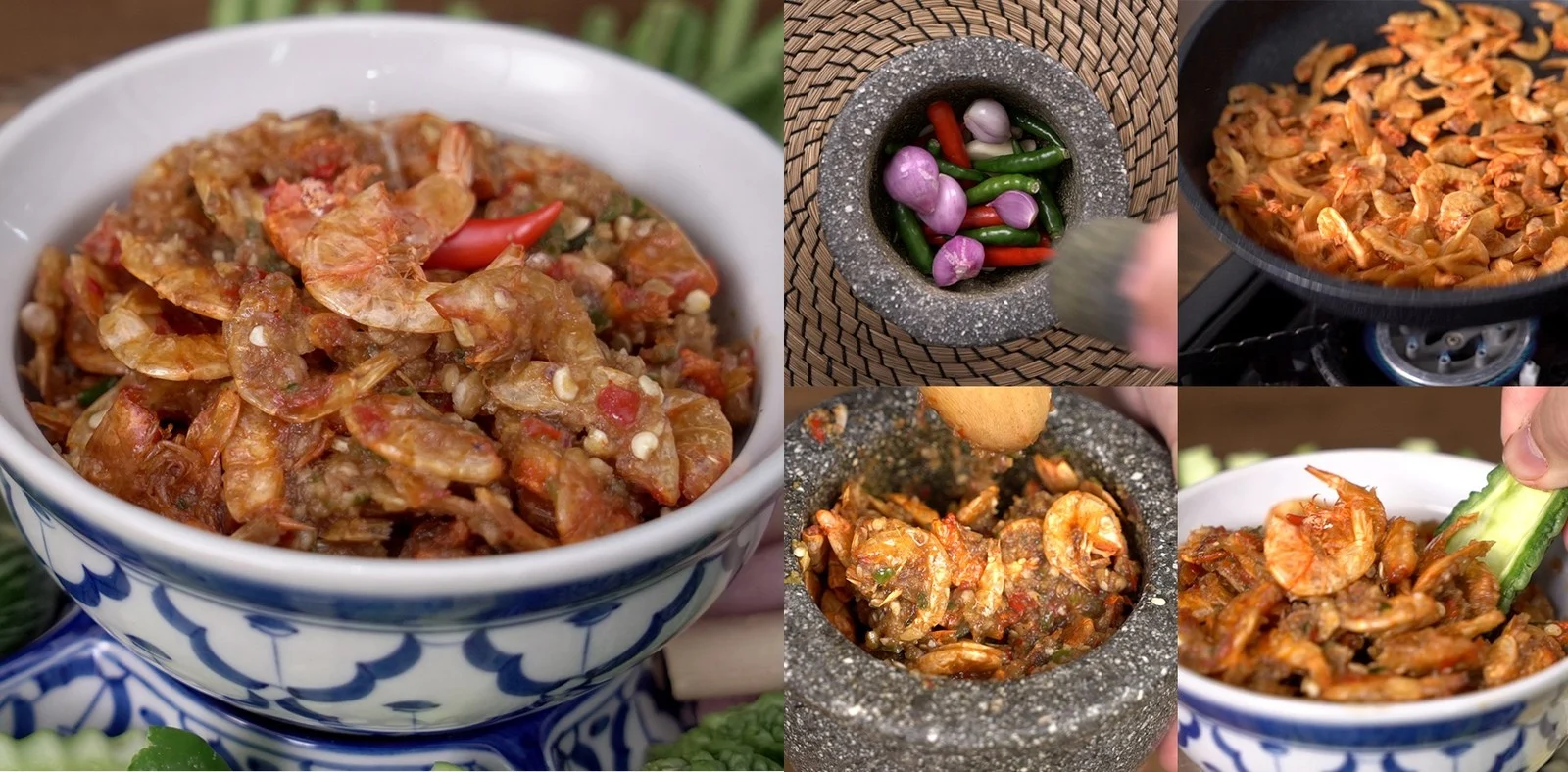 - ตักกุ้งเสียบที่คั่วไว้ลงในครก คลุกให้เข้ากัน