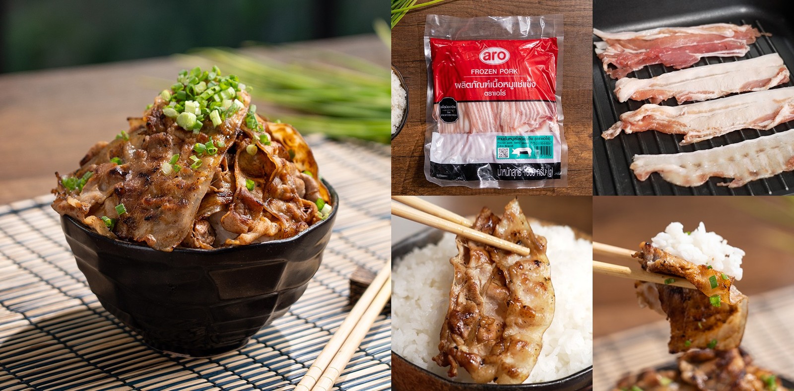 - หมัก สามชั้นหมูสไลซ์แช่แข็ง ตราเอโร่ ด้วยโชยุ มิริน สาเก เป็นเวลาประมาณ 30 นาที