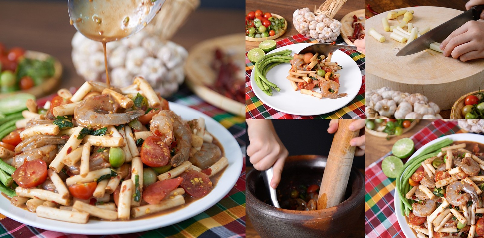 – ตักตำไหลบัวกุ้งสดใส่ลงในจาน เสิร์ฟพร้อมถั่วฝักยาว ผักสดเพื่อตัดรสชาติความเผ็ด เท่านี้ก็เชิญแซ่บได้แล้วจ้า