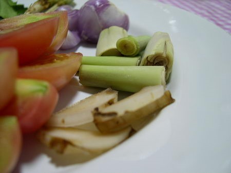 ตะไคร้ ล้าง ทุบ ๆ หั่นเป็นท่อนตรงหรือเฉียง ๆ ตามชอบคะ หั่นจากโคนต้นขึ้นมาสัก 2 นิ้วนะคะหัวหอมแดง ปอกเปลือก ล้าง ทุบ ๆ ไว้คะ