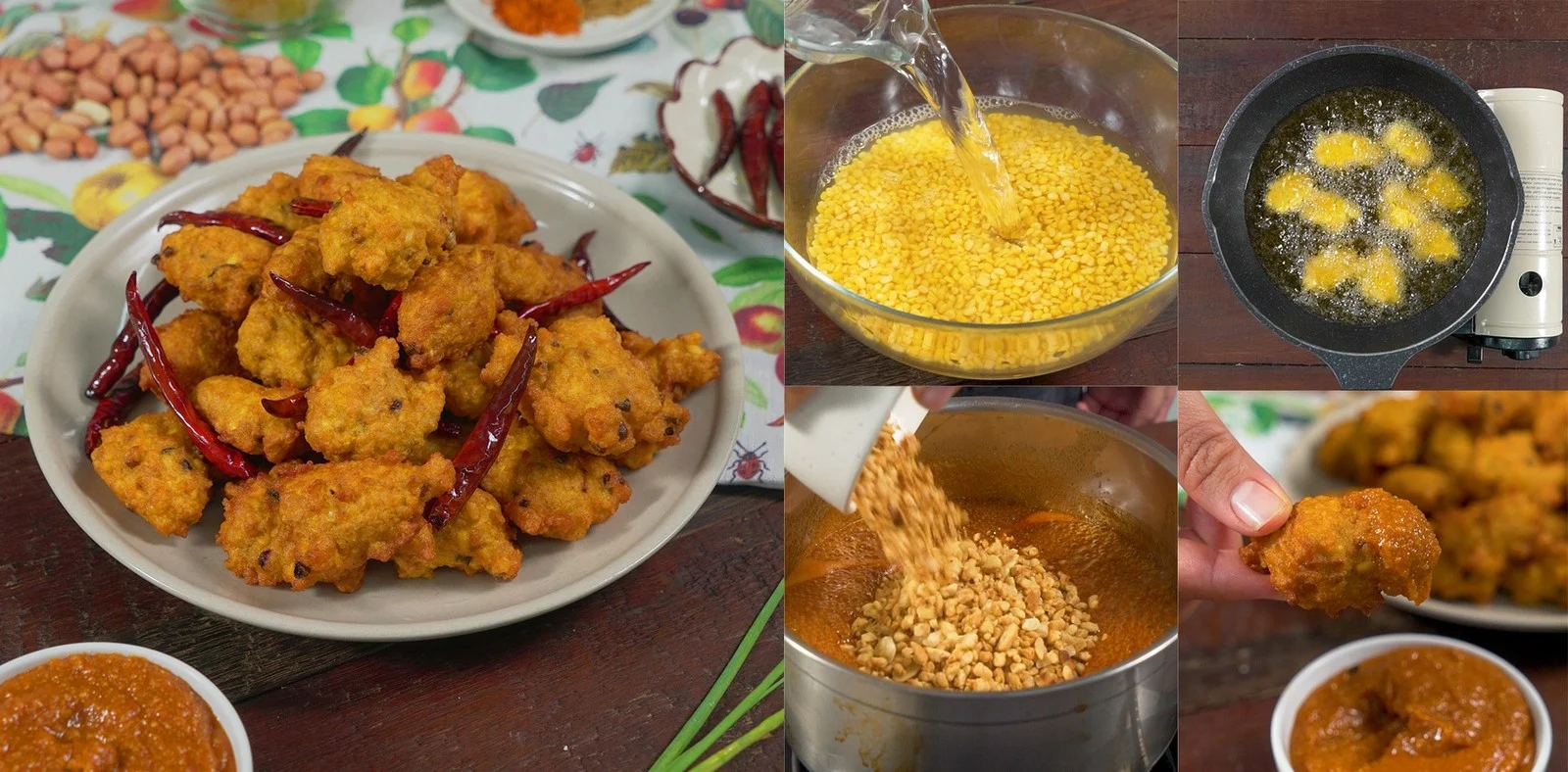 - นำถั่วเขียวเลาะเปลือกที่ตำแล้วมา ผสมกับแป้ง ลูกผักชี ยี่หร่าป่น ผงกะหรี่ ขมิ้น คนให้เข้ากัน