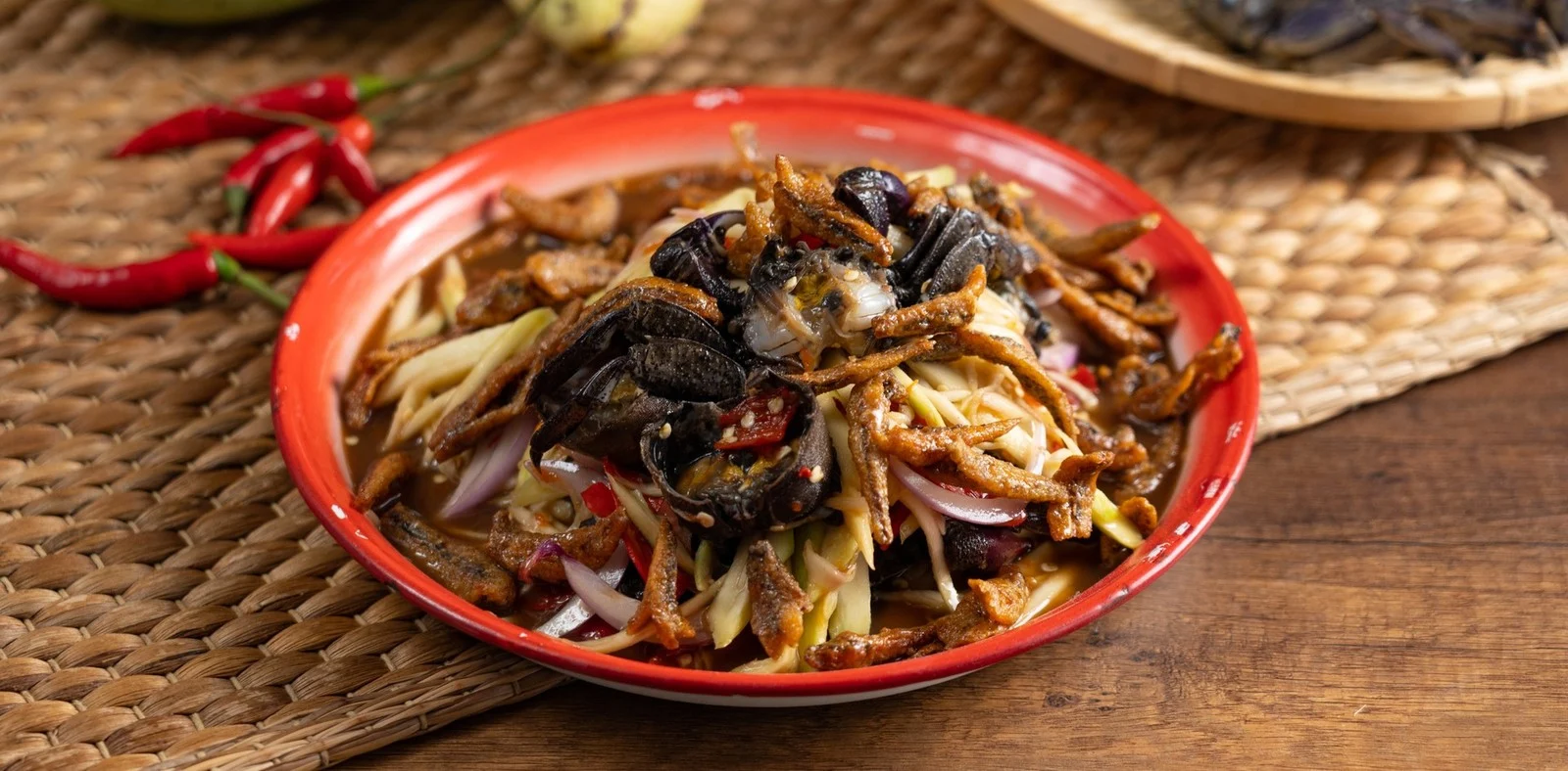 - นำมะม่วง หอมแดง ปูจืดลงมาคลุกเคล้า ตักใส่จานเสิร์ฟ โรยปลากรอบให้ทั่วก็เป็นอันเสร็จ