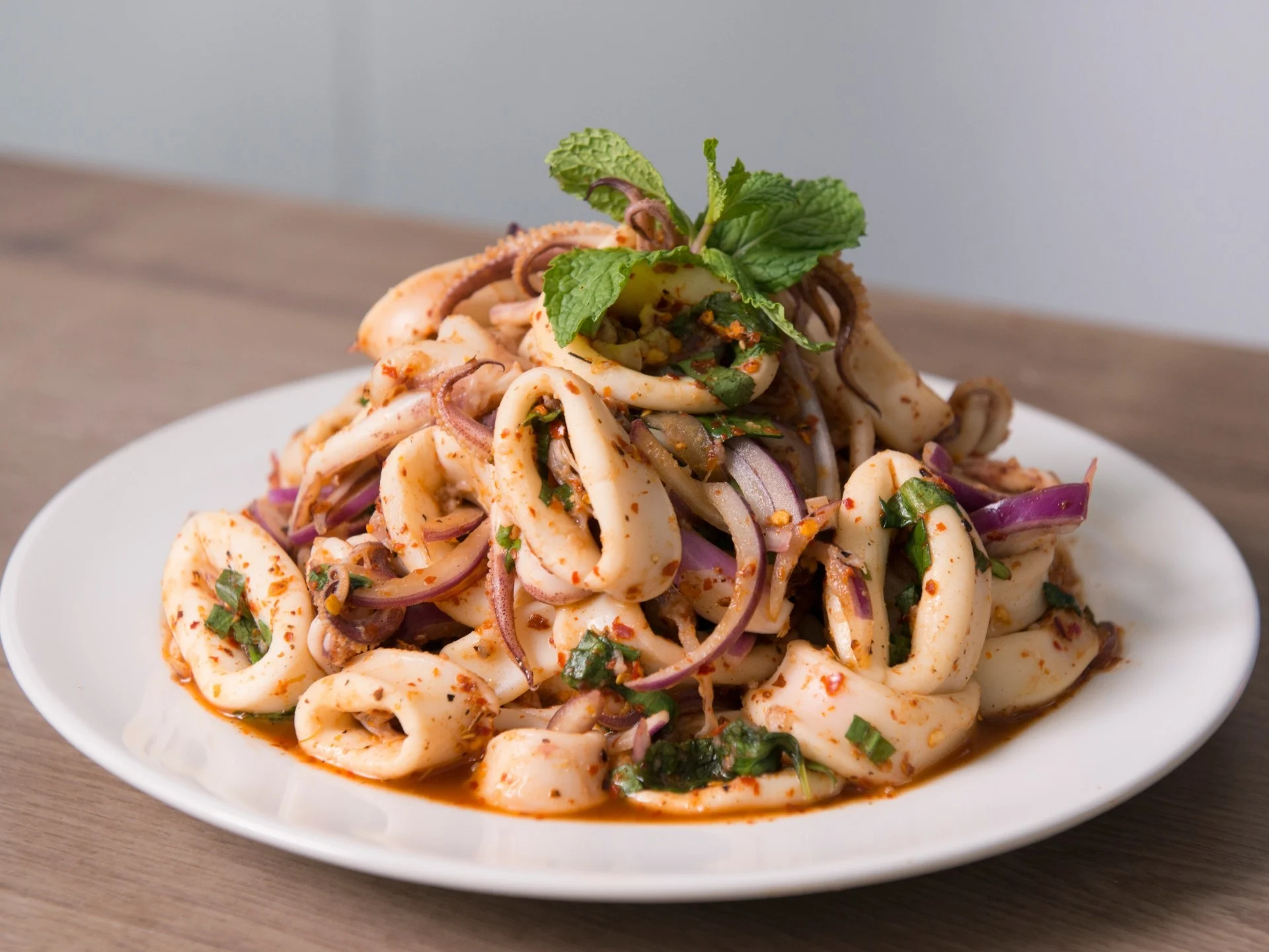 – ใส่ปลาหมึกที่ย่างเตรียมไว้ลงไป ตามด้วยหอมแขกซอย ผักชีฝรั่งซอย ใบสะระแหน่ และข้าวคั่ว คนให้เข้ากัน จากนั้นตักใส่จาน พร้อมเสิร์ฟจ้า 🙂