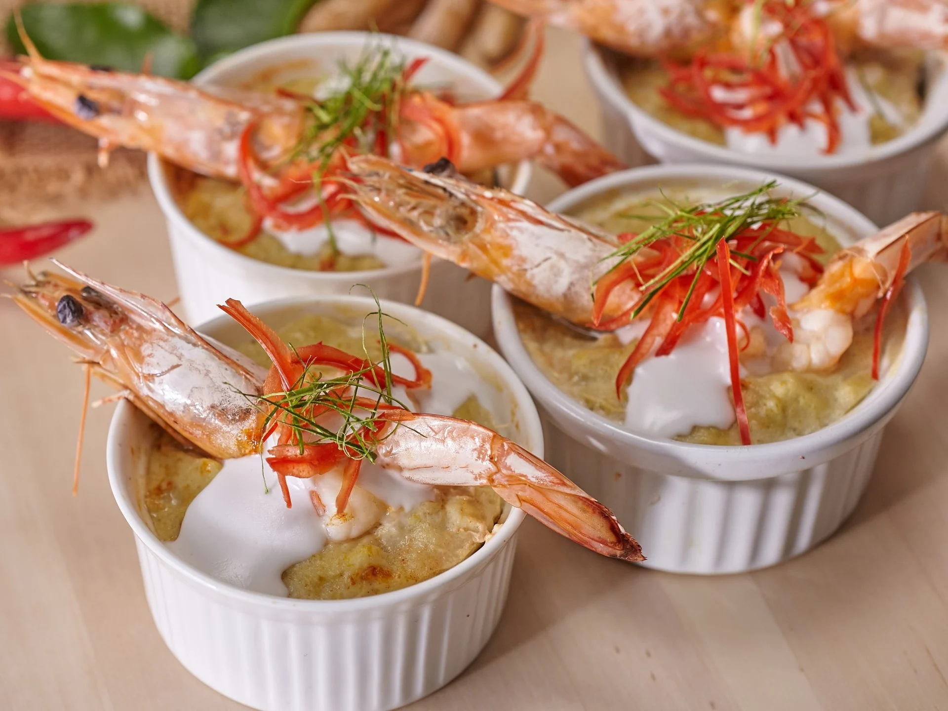 – นำห่อหมกกุ้งที่ได้มาราดหัวกะทิข้นลงไป โรยด้วยใบมะกรูดและพริกชี้ฟ้าแดง เท่านี้ก็ได้ “ห่อหมกกุ้ง” พริกแกงเขียวหวาน แล้วจ้า