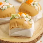 - จากนั้นนำขนมปังมายัดไส้ด้วยสลัดกุ้งที่ทำไว้ ห่อด้วยกระดาษไขก็พร้อมเสิร์ฟ