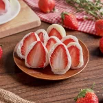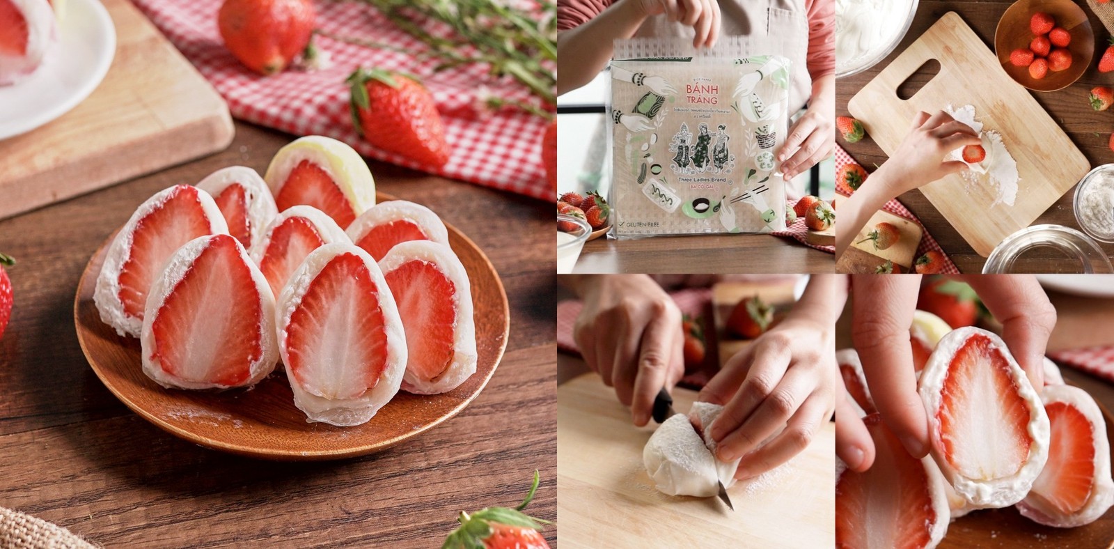 - ตัดแบ่งใบเมี่ยงญวนให้ได้ 2 ส่วน แล้วนำชุบน้ำหมาด ๆ วางบนเขียง โรยแป้งข้าวเหนียวที่คั่วไว้ จากนั้นบีบวิปครีมบนใบเมี่ยง วางสตรอว์เบอร์รี่โดยเอาด้านแหลมลง แล้วบีบวิปครีมให้คลุมสตรอว์เบอร์รี่ ห่อด้วยใบเมี่ยงให้มิด แล้วพลิกกลับด้าน วางเรียงในถาด คลุมด้วยพลาสติกแรป แช่ฟรีซประมาณ 20 นาที